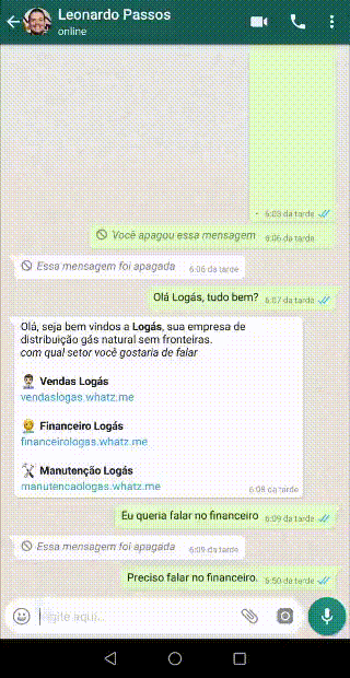 Quando o cliente clicasse em Financeiro, iria para o WhatsApp do Financeiro, o robô do Financeiro se ativaria e os operadores do Financeiro responderiam.
